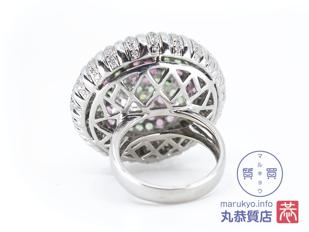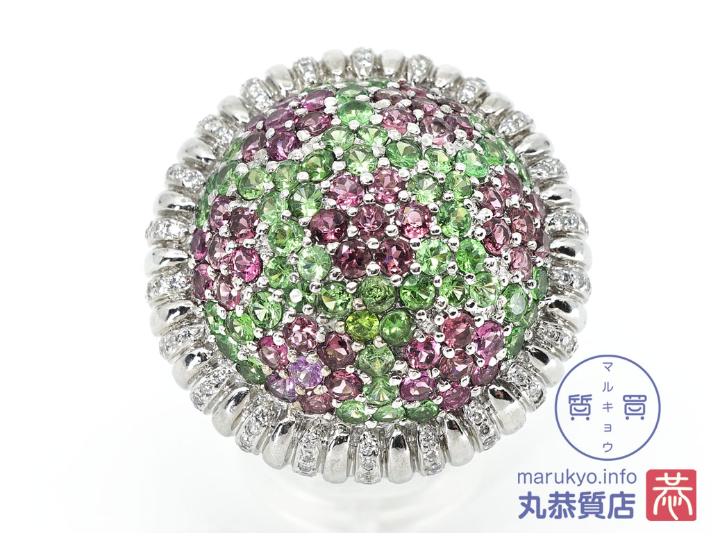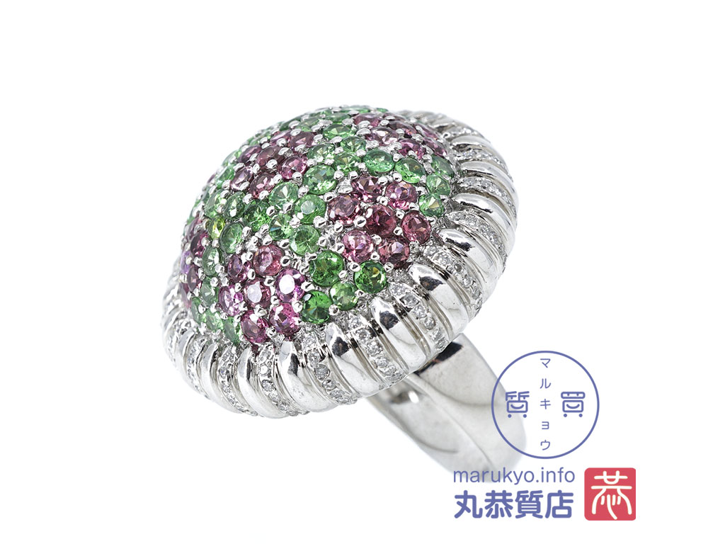しっかりとしたK18 ホワイトゴールドの台に、ダイヤモンド、グリーンガーネット、ピンクトルマリンをたっぷりとあしらった、ボリューム感のあるマルチカラーリングです。